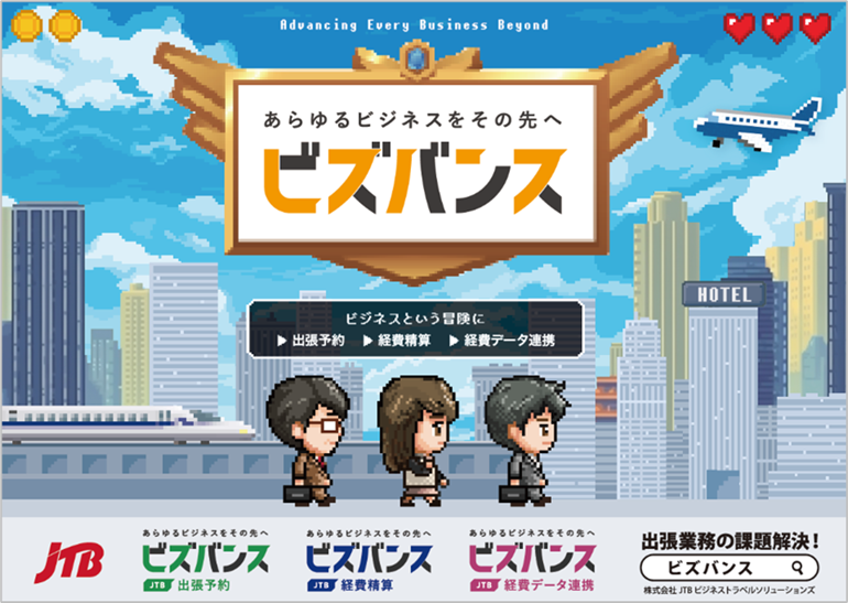出張を単なる「目的地への移動」ではなく、「お客様が商談の成功・目的の達成のために行うもの」と捉え、「出張=冒険」というコンセプトのもと、RPG(ロールプレイングゲーム)の世界観で表現。お客様の冒険の成功に必要なアイテムが「ビズバンス」であり、「ビズバンス」を通じて、お客様の出張、そしてその先にある「ビジネスの成功」をサポートするという意志を描いている。****** ******** ********** ********** ********* *******