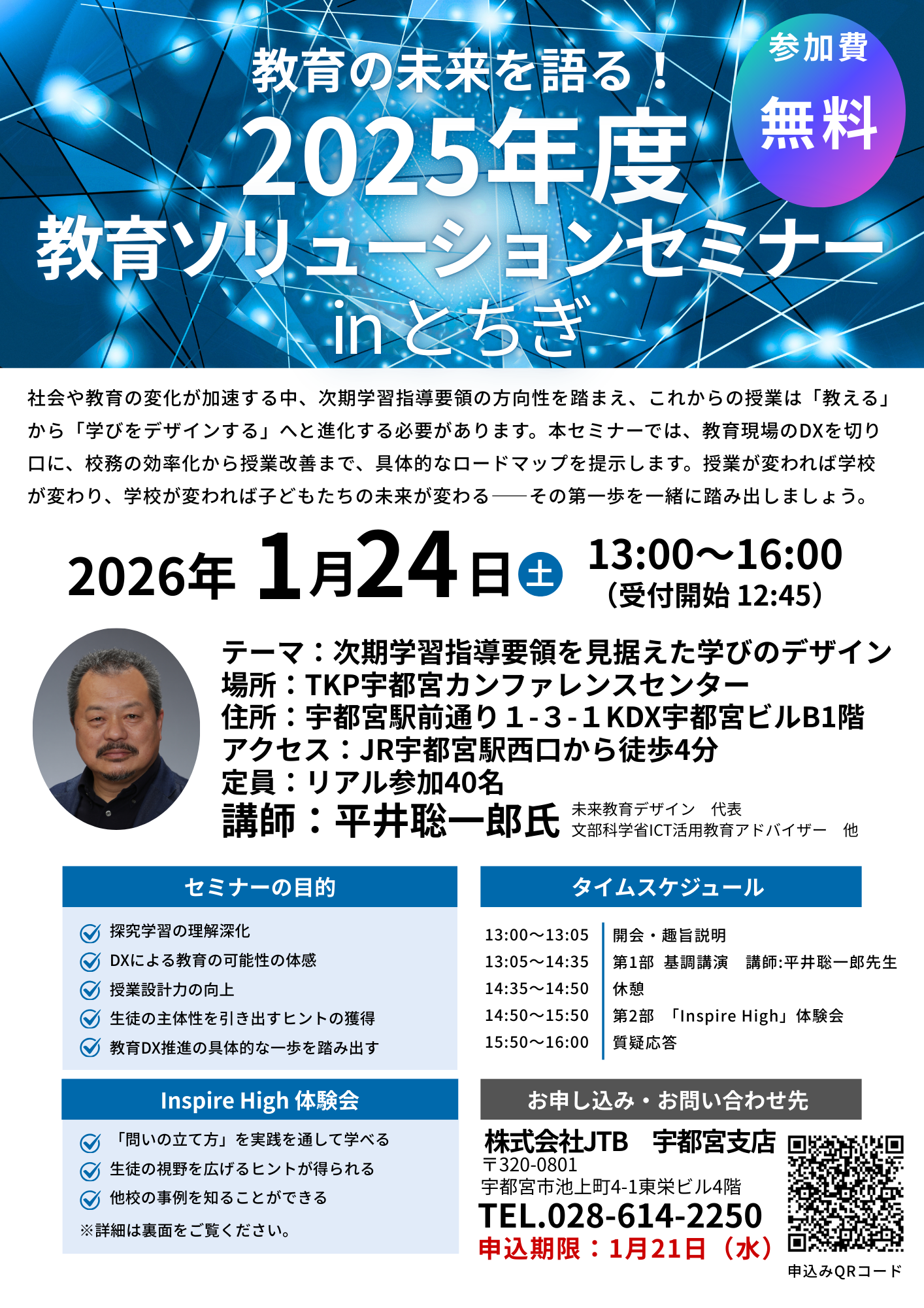 社会や教育の変化が加速する中、次期学習指導要領の方向性を踏まえ、これからの授業は「教える」 から「学びをデザインする」へと進化する必要があります。本セミナーでは、教育現場のDXを切り口に、校務の効率化から授業改善まで、具体的なロードマップを提示します。授業が変われば学校 が変わり、学校が変われば子どもたちの未来が変わる――その第一歩を一緒に踏み出しましょう。