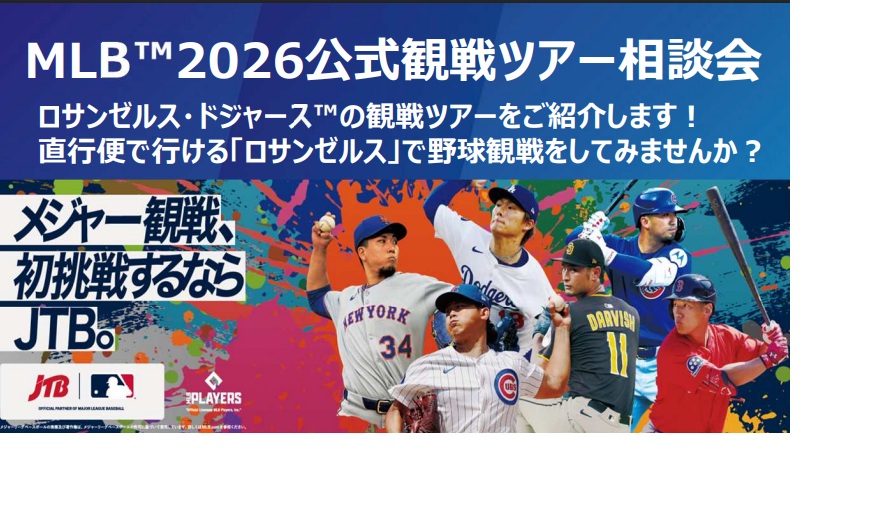JTBは2024年よりMLB™のオフィシャルパートナーとなり、「MLB観戦券付き公式ホスピタリティ・パッケージ」を取り扱えるアジアで唯一の旅行会社となりました。2026レギュラーシーズンも安心の添乗員同行ツアーや日程が自由に選べるフリープランなど各種観戦ツアーをご用意しております。相談会を開催いたしますので、この機会にぜひご相談ください😊