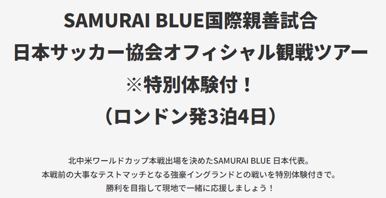 【先着申込受付中!】SAMURAI BLUE国際親善試合 日本サッカー協会オフィシャル観戦ツアー(ロンドン発3泊4日)New!
