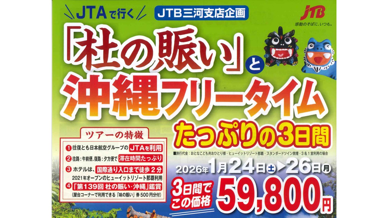 10月1日発売! JTB三河支店企画 「杜の賑い」と沖縄フリータイム3日間