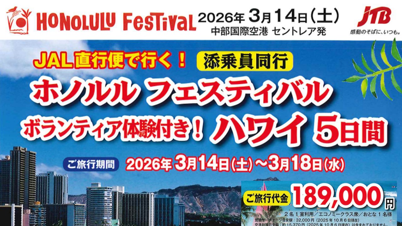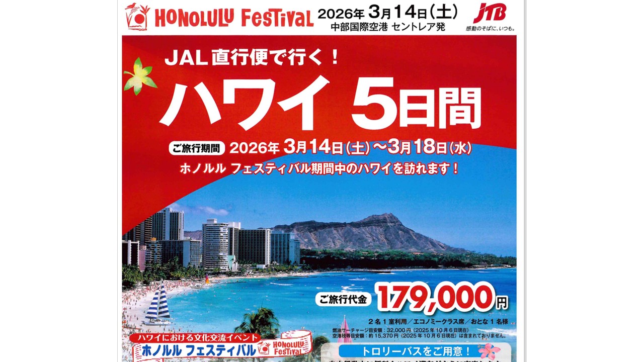 ホノルルフェスティバルは、1995年に日本とハワイの交流文化を目的として誕生しました。ハワイの方々に日本の様々な文化を、参加する皆様にはハワイの国際色豊かな多民族社会の文化に触れられるイベントです。毎年3月に開催される恒例行事として定着、環太平洋の文化交流促進事業としてハワイにおける最大の文化交流イベントとなっています。2026年3月14日(土)出発 5日間 JAL直行便利用 フリープランなので思い思いにお楽しみください。お申し込みはこちらから。