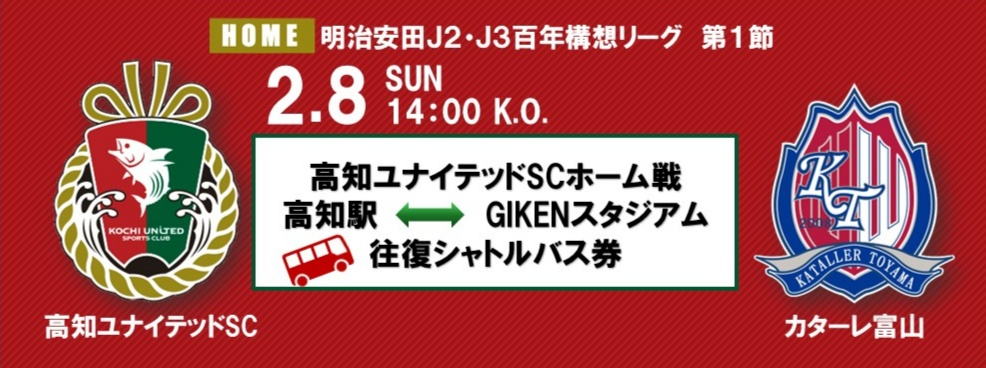⚽「明治安田J2・J3百年構想リーグ 地域リーグラウンド WEST-Aグループ 第1節 高知ユナイテッドSCホーム戦(vsカターレ富山)」も 高知駅からGIKENスタジアムを往復する直通のシャトルバスを運行いたします。