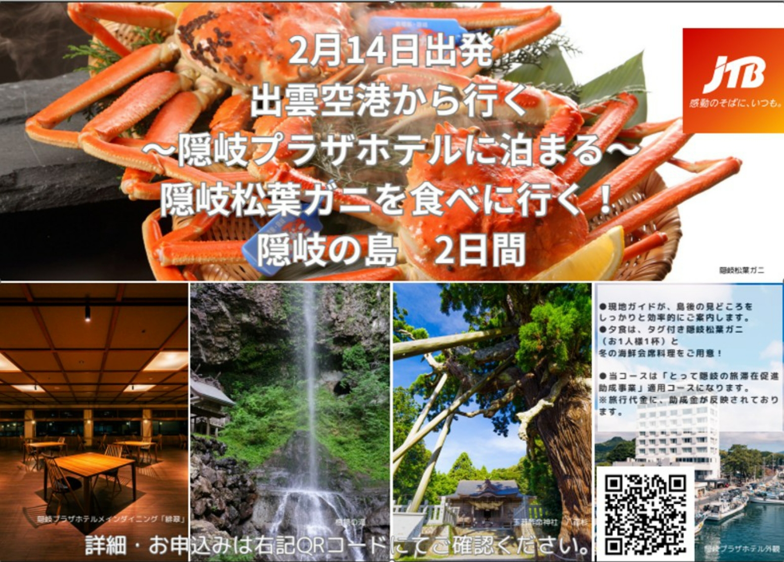 - バレンタインに特別な旅を! 2月14日出発なので、大切な方とのバレンタイン旅行にもぴったり。隠岐の絶景と美食を共有し、忘れられない思い出を作りませんか?