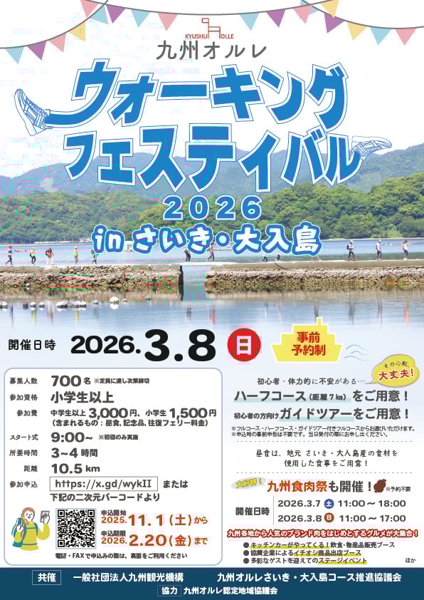 2026年3月8日(日)、豊後水道に浮かぶ美しい大入島で九州オルレウォーキングフェスティバルを開催します。10.5kmのコースでは、透明度抜群の海と緑豊かな自然、島ならではの絶景ポイントを巡ります。初心者向けハーフコース(7km)やガイドツアーもご用意。同時開催の九州食肉祭では地元グルメも堪能できます!